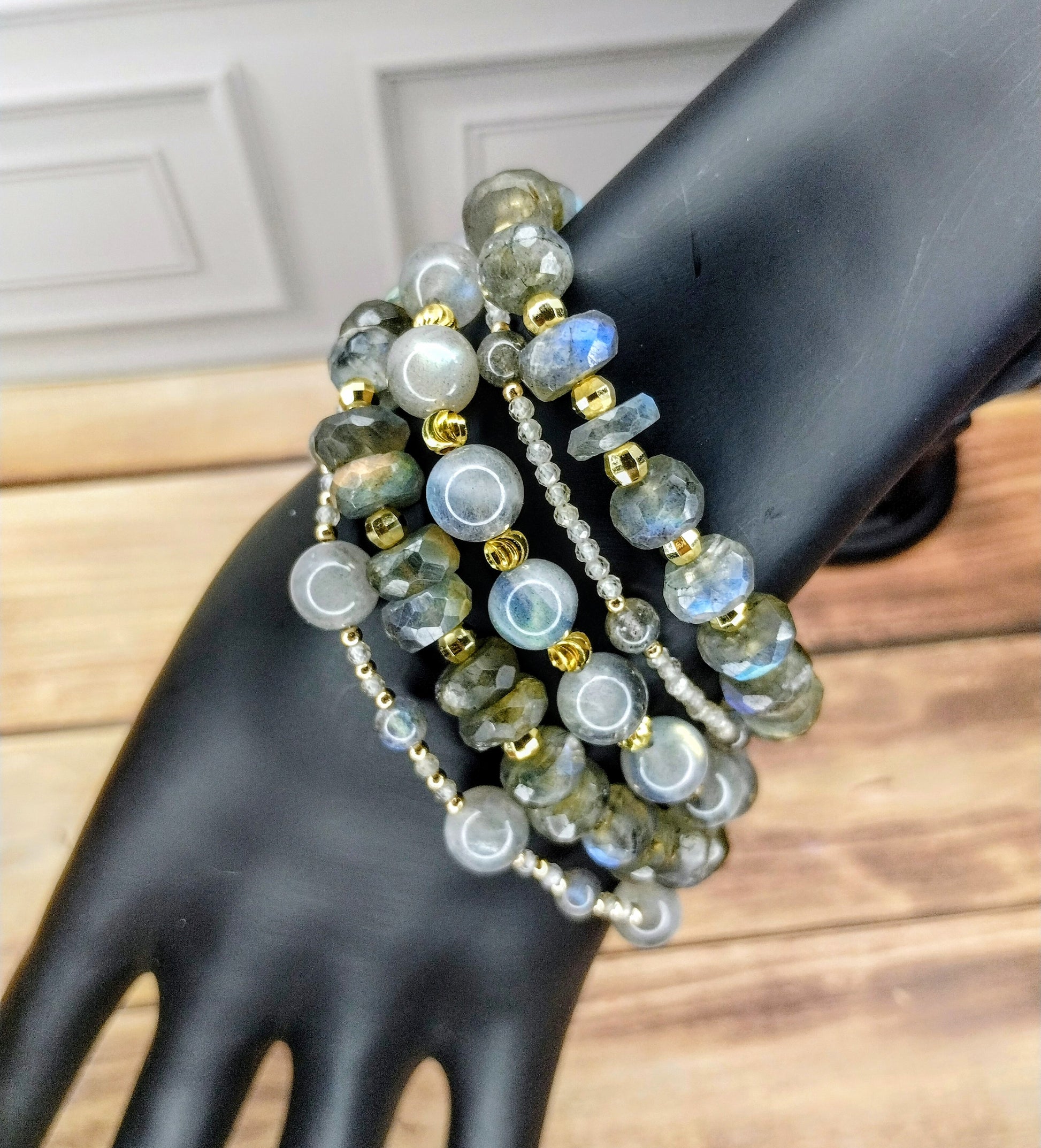 Each labradorite bead offers subtle flashes of blue fire that shift beautifully in motion, while the zircon adds a refined sparkle with its naturally high brilliance. Finished with 14kt gold-filled hardware, this bracelet feels both modern and timeless.